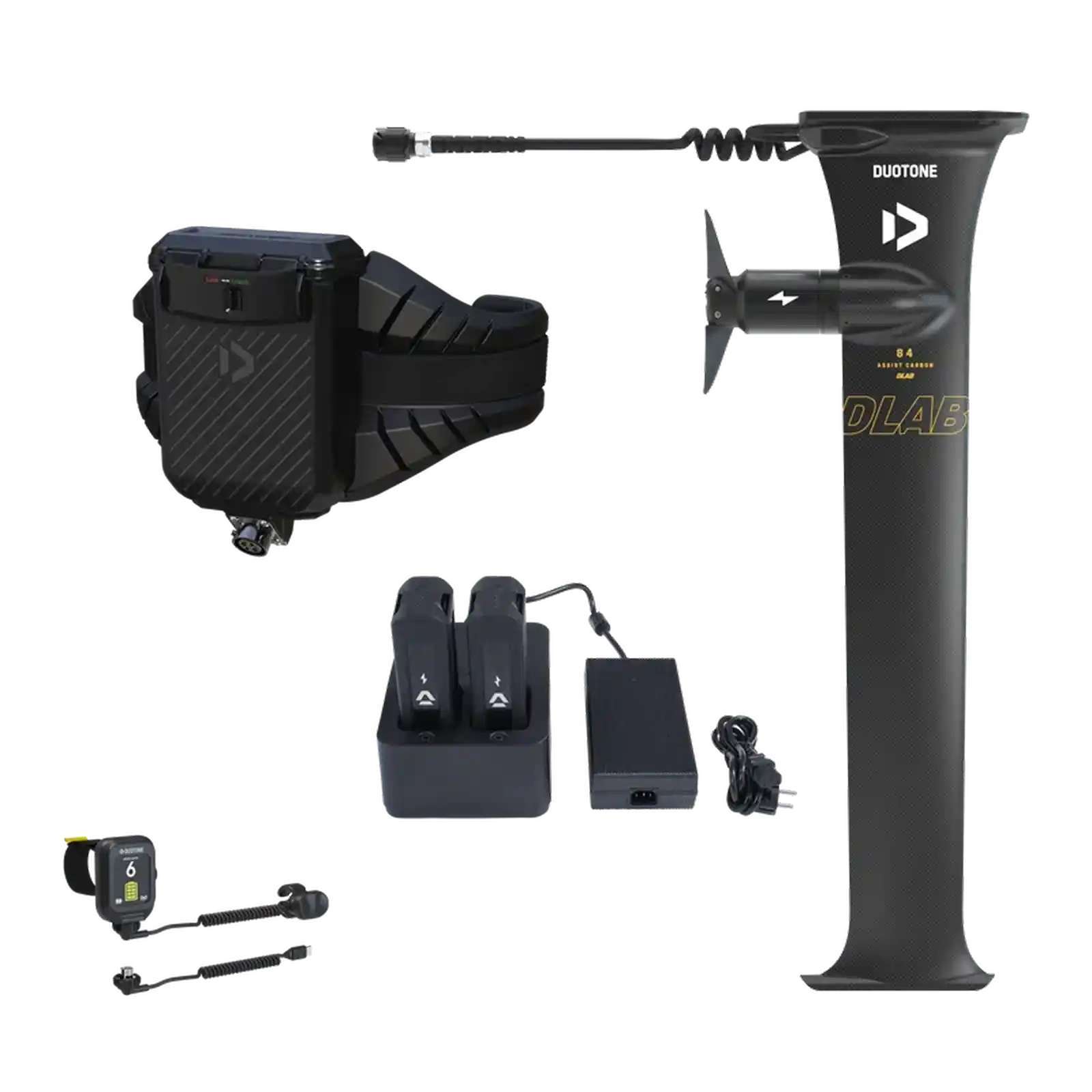 - Inclus : Mât eMAST D/LAB propulseur intégré, télécommande Duotone eRemote Watch Ring Set, harnais batterie Duotone eHarness Set, chargeur batteries, câble de connexion, coussins de bague, bracelet XL, housse de protection